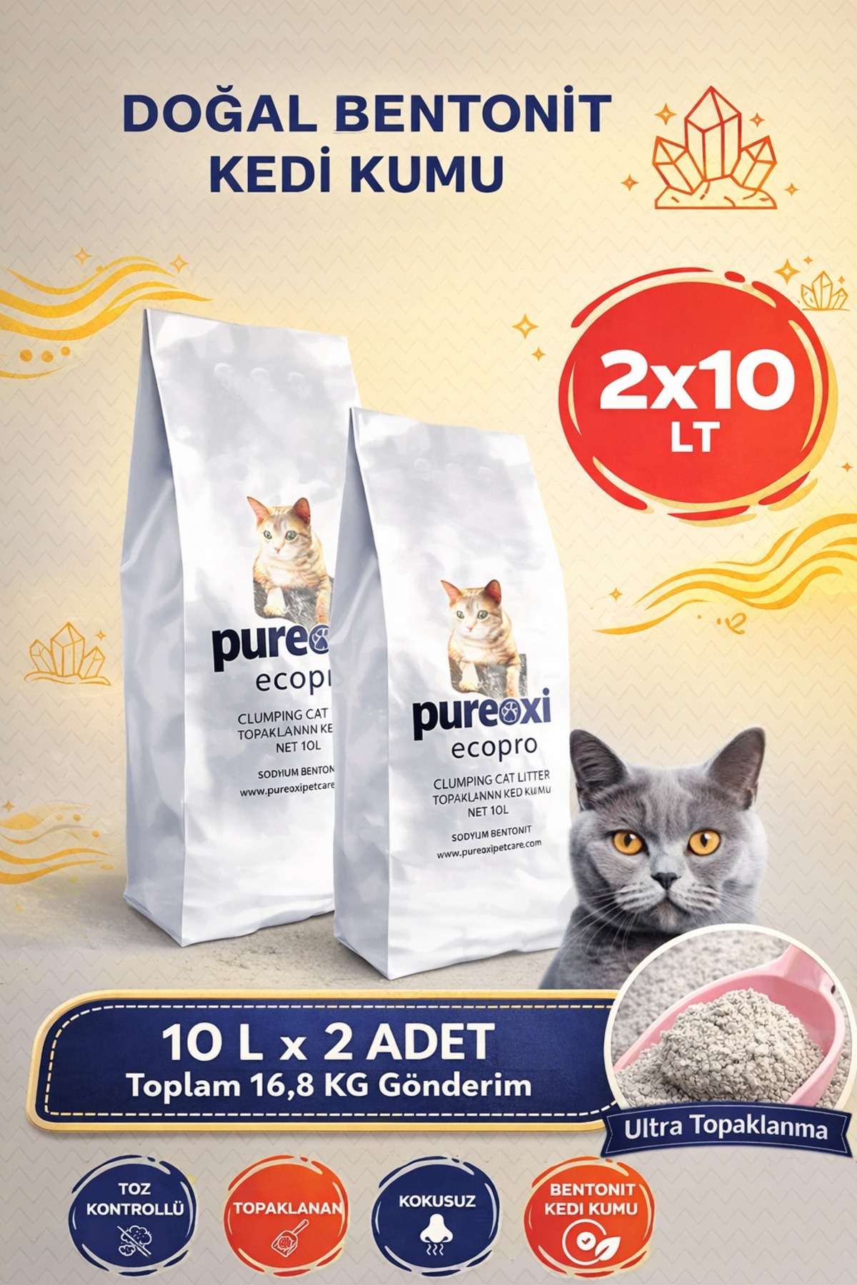 PureOxi 2x10 LT Avantaj Paketi: Ecopro Topaklanan Kokusuz Bentonit Kedi Kumu